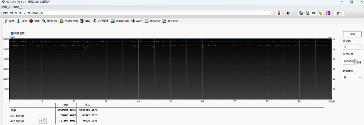 ▲紫光内存UNIS SSD S2 Ultra的稳定性能在HD Tune Pro 100G文件测试中,也能看得出来,显示为读取速度的蓝线和显示为写入速度的橙线波动都比较小。