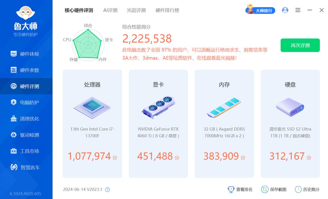 ▲鲁大师可以快速识别硬盘为紫光内存UNIS SSD S2 Ultra 1TB版。