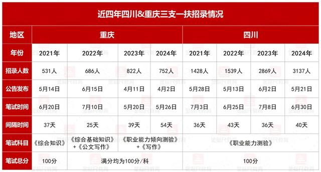 加上重庆三支一扶有一门考《职业能力倾向测验》,与四川三支一扶考《职业能力测试》考试内容重合度高,两者都类似省考的《行测》。也就是说:重庆和四川两地三支一扶考试是可以同时备考的。