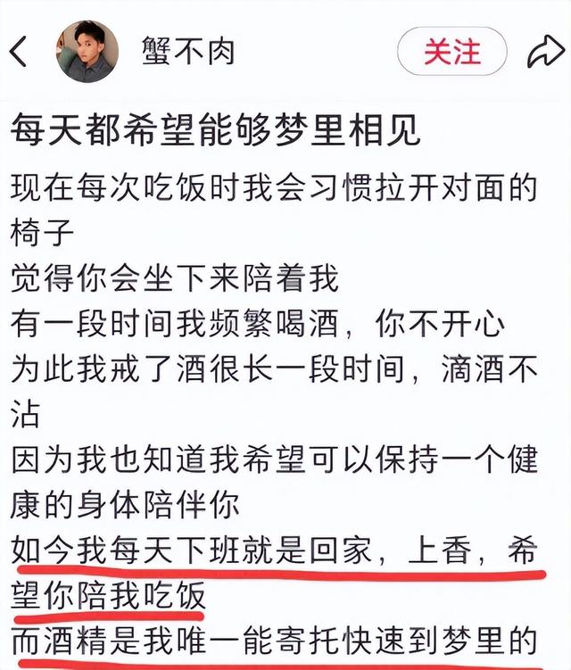 在社交平台上,他经常深夜发文,表达自己的痛苦以及对妻子的思念。