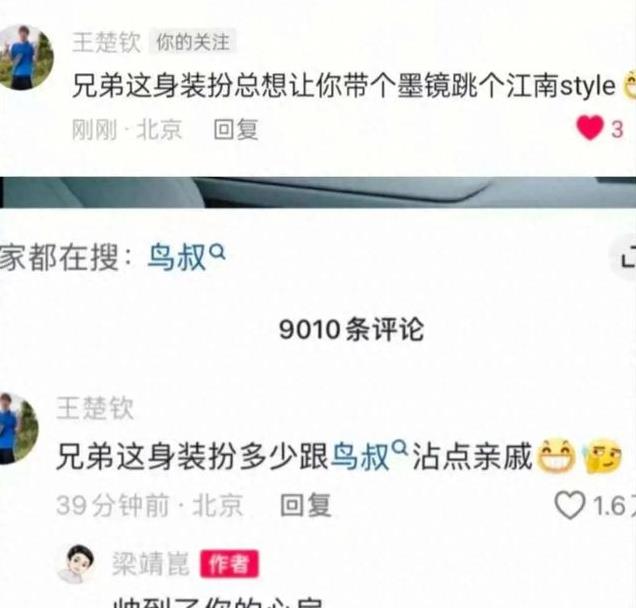 王楚钦在梁靖崑的评论区先评论了一句,真想让你在带个墨镜,跳个江南style。后面又补刀补了一句,你这打扮多少和鸟叔沾点亲戚关系。梁靖崑也是十分幽默的回应了一句,帅到你的心房了。