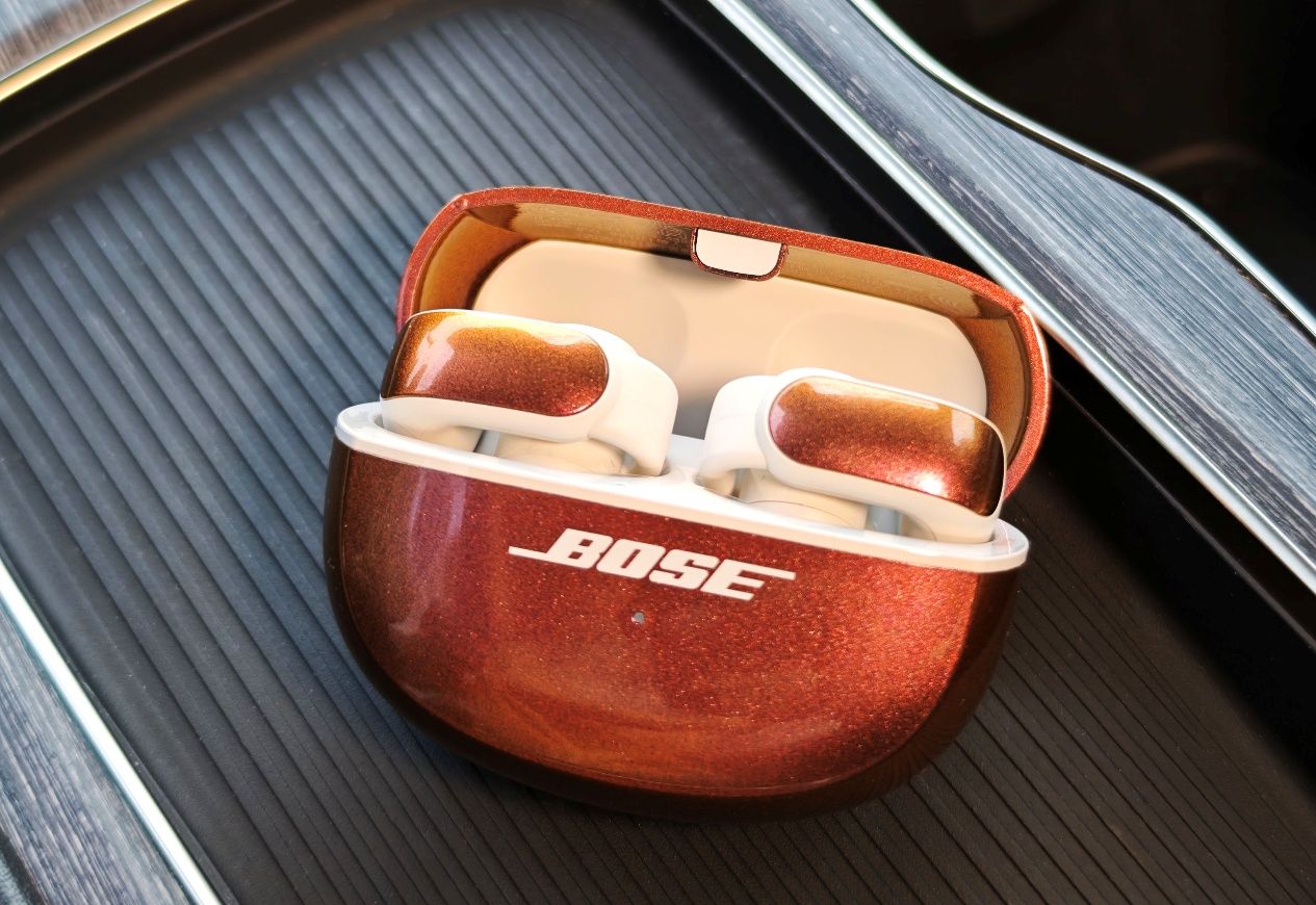 Bose Ultra的日落幻彩色,外壳采用多层渐变镀膜工艺,从金色过渡到紫红色,仿佛将落日的余晖凝固于耳机表面。耳机仓的设计同样别出心裁,形如鹅卵石般圆润光滑,边缘辅以棱线切割,搭配白色分界线和Bose Logo,既保留了极简主义风格,又增添了几分未来感。这种设计语言打破了电子产品的冰冷印象,赋予其一种“可佩戴的艺术品”属性。