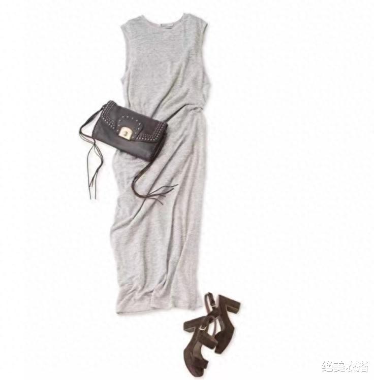 比如,下图的灰色长裙+深褐色鞋包,浅色与深色相得益彰,低调且有优雅张力。