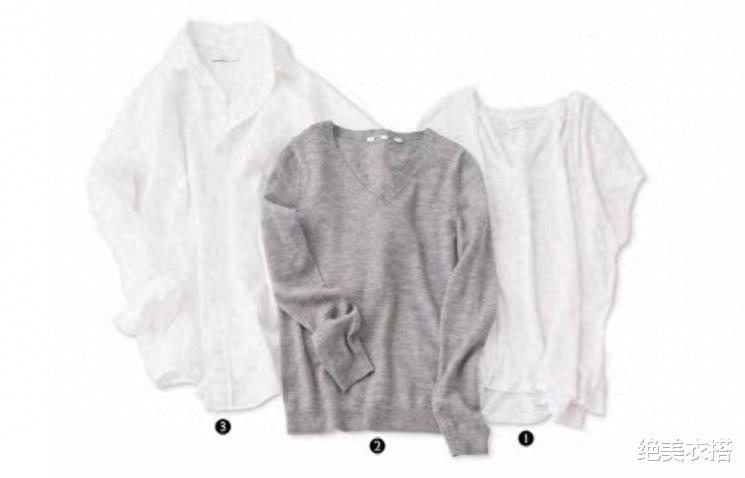 3件上衣:白衬衫、灰色V领针织衫、白T恤