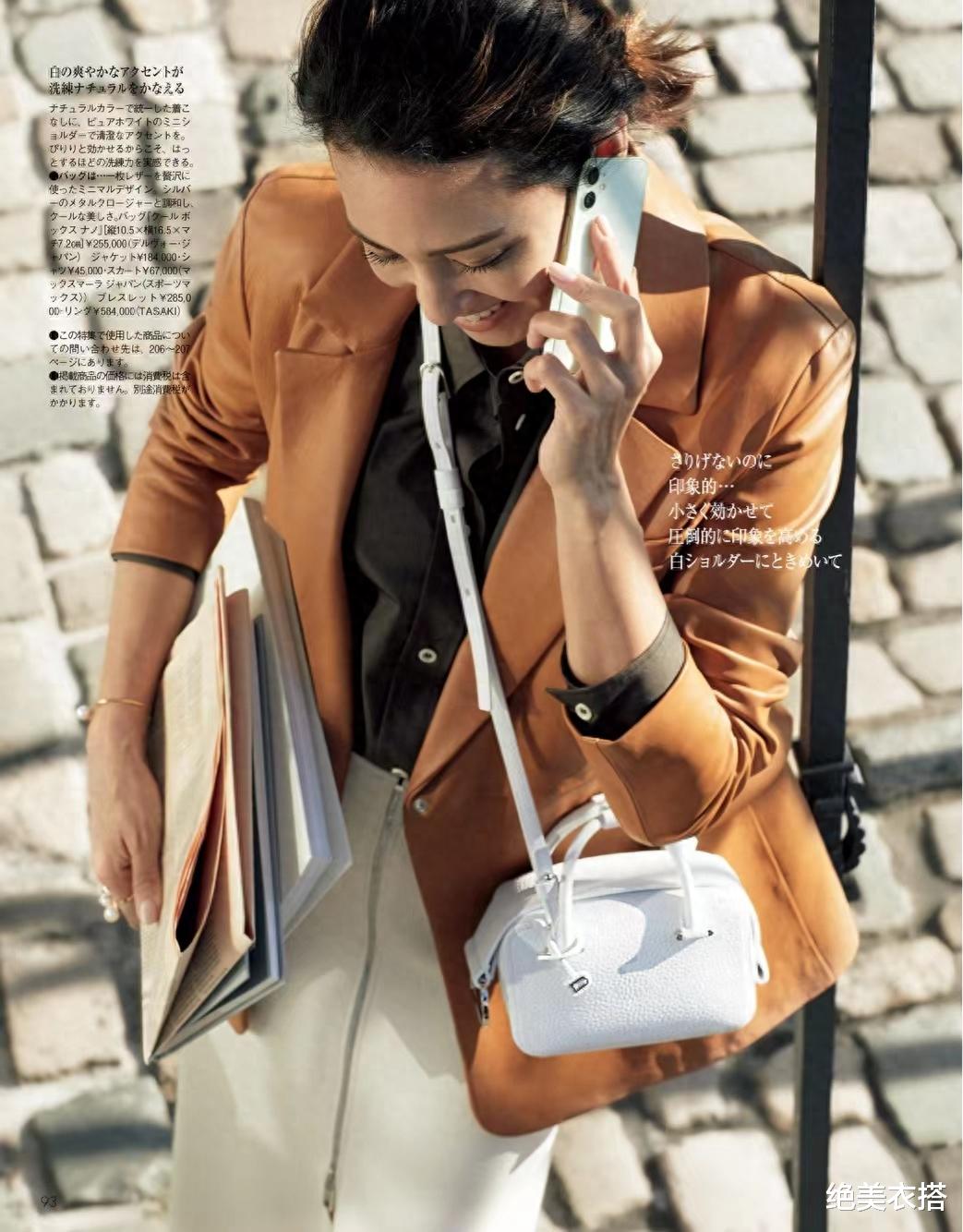 白色上衣+白色裤子,用深褐色高跟单鞋、同色大包包点缀,整体层次分明,呼应有礼有节,深与浅、明与暗,全都照顾到。