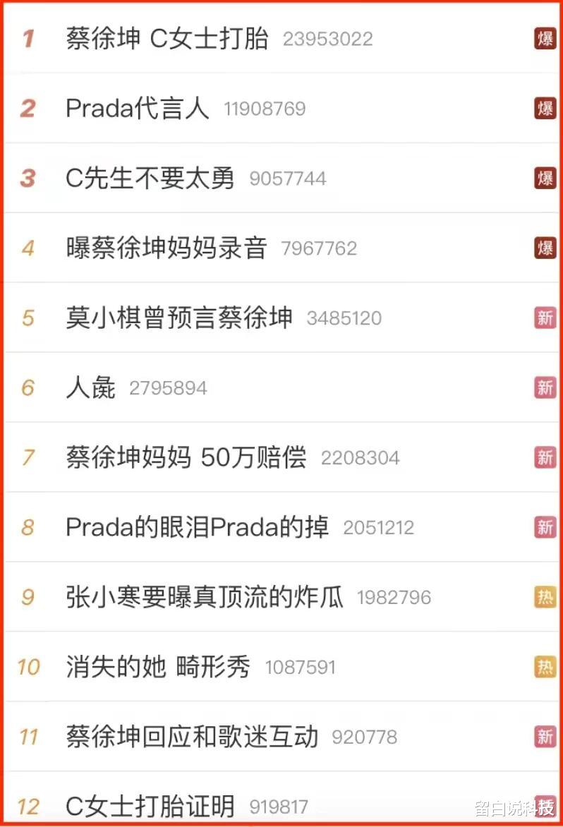 据说蔡母之前给了C女子50万作为赔偿金,显然C女子不满足于区区50万,说不定早就花完了。现在她看到蔡徐坤大红大紫,身价不可估量,50万太少了吧,至于她想要多少,大家可以放心大胆去猜测。