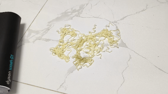 对于清洁能力测试,这里模仿大多数用户日常家用场景,包括宠物毛发问题、固体垃圾、厨房豆瓣酱、面食进行实际测试,档位选择低水量进行。