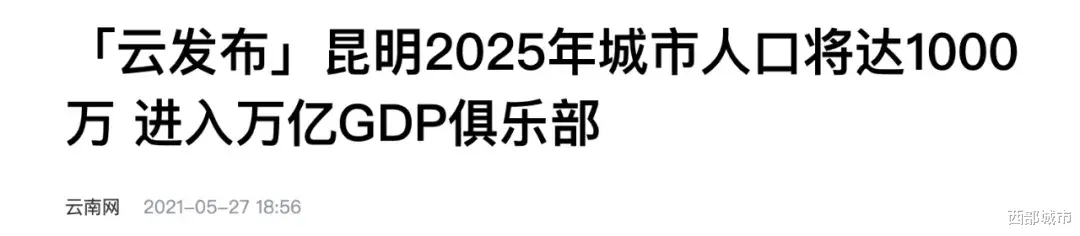 两年后的2022年,昆明将这一目标延迟一年,当年的市政府工作报告提出,到2026年,预计经济总量将达到1万亿元以上,常住人口达到1000万人以上。