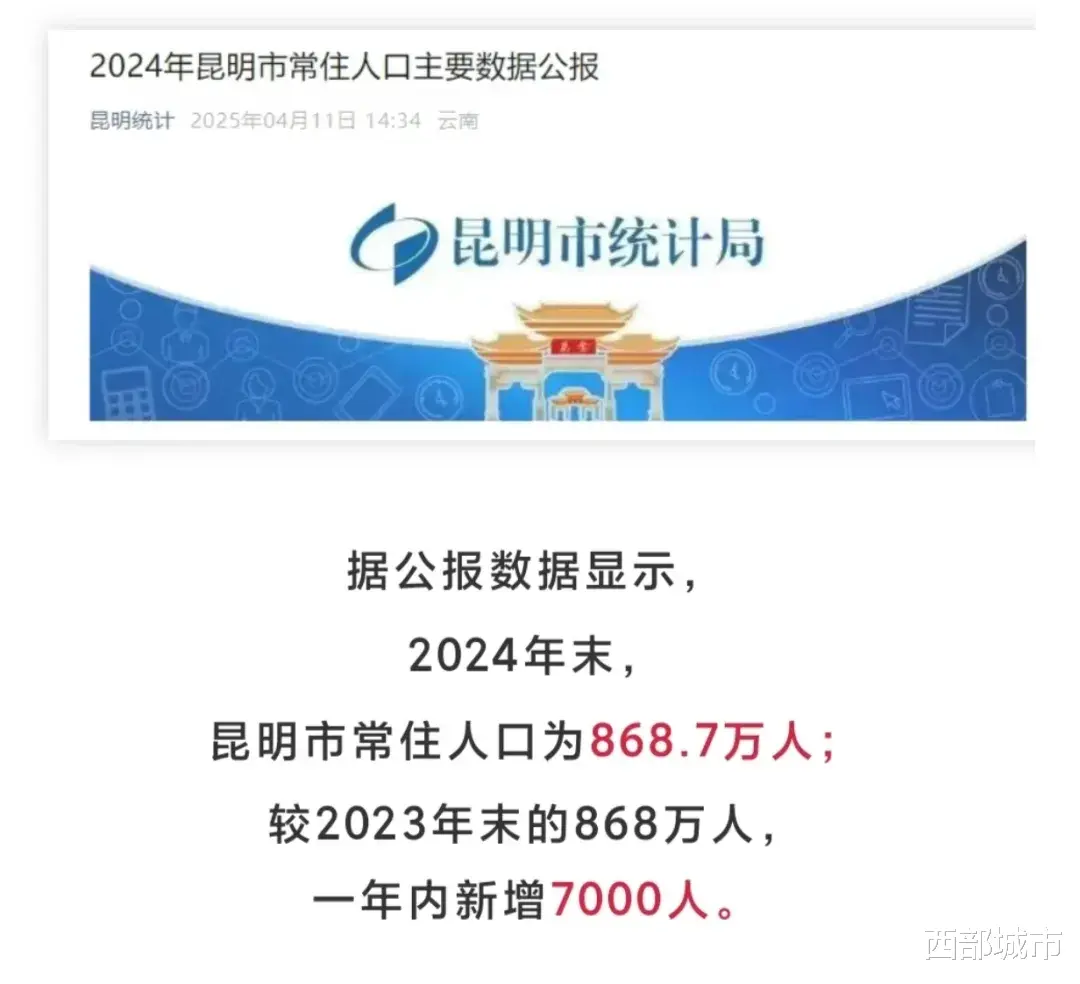 根据昆明市统计局日前发布的数据,2024年末,昆明市常住人口为868.7万人,较2023年末的868万人,仅新增7000人。