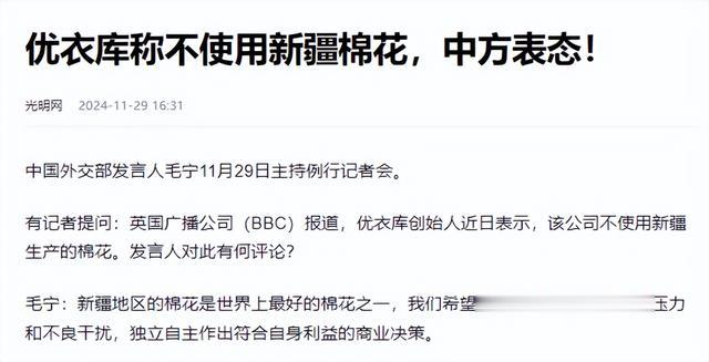 光明网 2024-11-29 优衣库称不使用新疆棉花,中方表态!