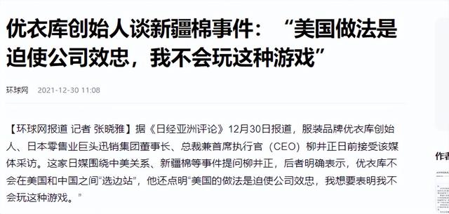 环球网 2021-12-30 优衣库创始人谈新疆棉事件:“美国做法是迫使公司效忠,我不会玩这种游戏”