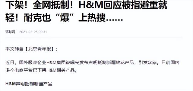 信源来自:环球网 2021-3-25 下架!全网抵制!H&M回应被指避重就轻!耐克也“爆”上热搜……