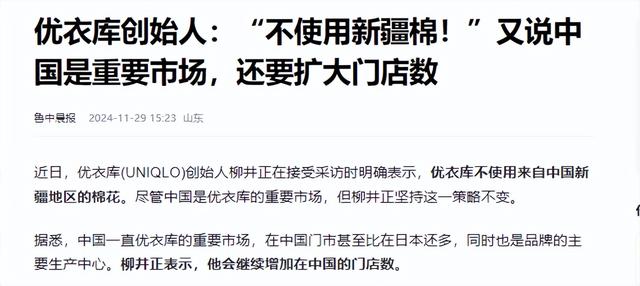 鲁中晨报 2024-11-29 优衣库创始人:“不使用新疆棉!”又说中国是重要市场,还要扩大门店数