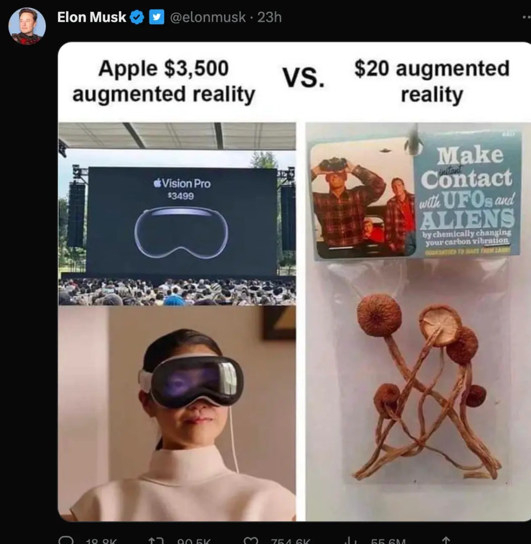 本月初,在苹果发布自己全新的vision pro头显之后,马斯克也发布了推特,他将3500美元的vision pro头显和20美元的致幻蘑菇放在一起,讽刺了苹果头显一把。