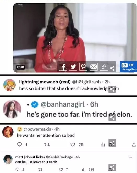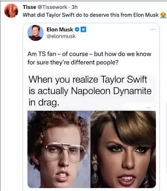 近日,特斯拉和SpaceX公司的CEO马斯克更新了自己的推特,发文暗示泰勒斯威夫特长的像男人。作为北美流型乐坛数一数二的当红歌手,泰勒斯威夫特拥有大量粉丝,这条推特自然引发了泰勒斯威夫特粉丝的强烈不满。部分泰勒斯威夫特的粉丝要马斯克先照照镜子看看自己再说,还有人回应究竟泰勒斯威夫特做了什么才会得到这种评价。显然,马斯克这次是招惹众怒了。