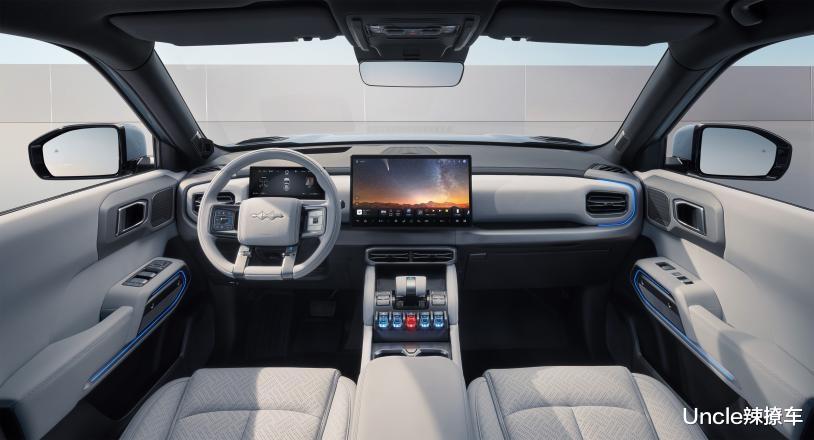 座舱内,飞翼式仪表台、C形星际氛围灯与豹系家族同款的“战车档把+水晶按键”,构建出极具科幻力的驾驶氛围;AI智能座舱与多功能灵动岛,支持语音交互、场景模式一键切换,15.6英寸中控屏、12英寸HUD与帝瓦雷音响,搭配人体工学座椅与冷暖冰箱,让每一程都沉浸于舒适与潮流乐趣中。