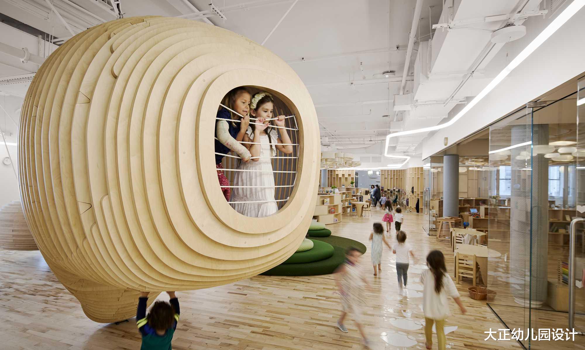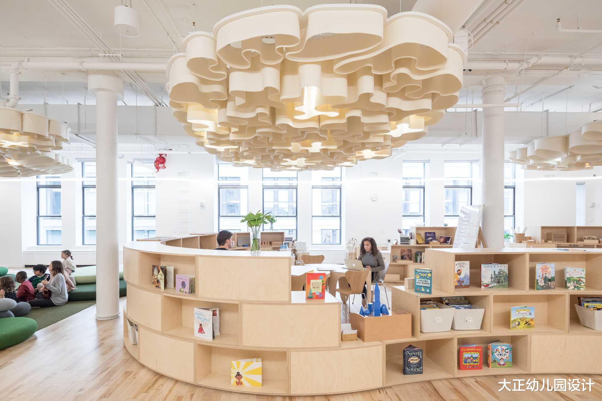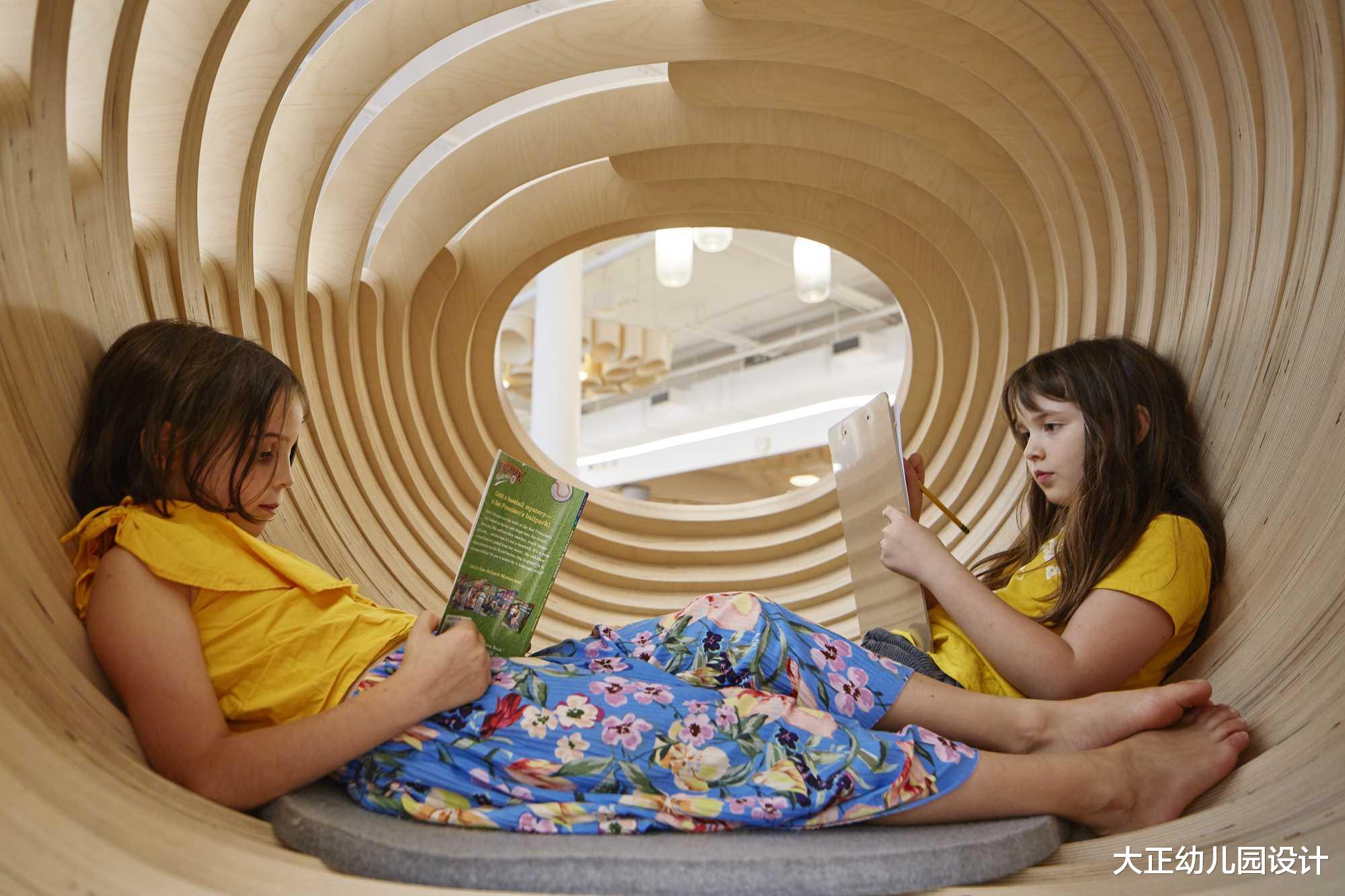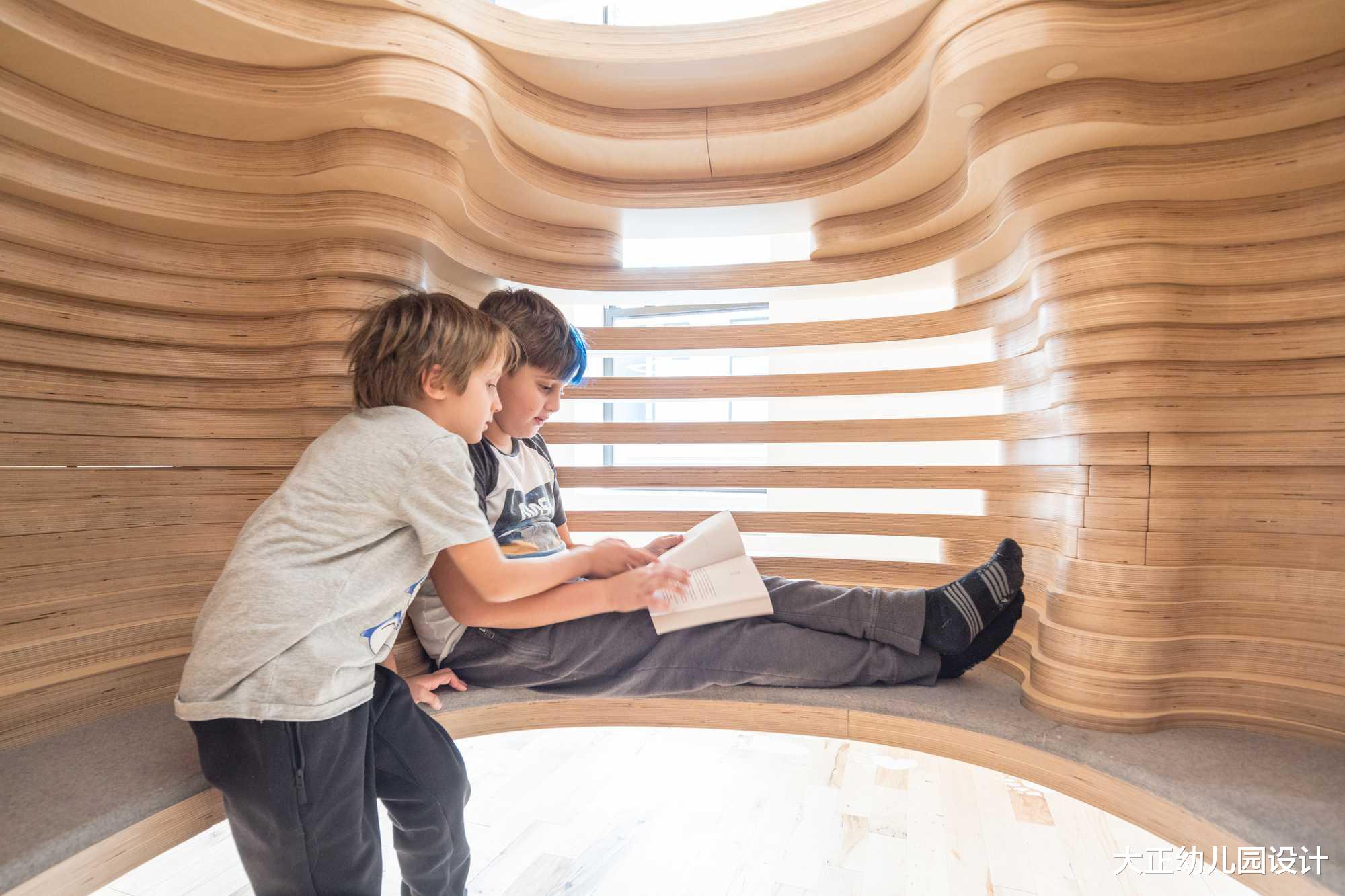 大厅中的木制装置,是一个全毛毡的休息室,孩子们可以进入其中,这是一个可以将玩和学习区分开的空间。