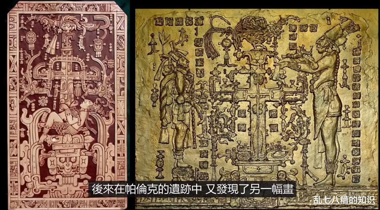 玛雅文明最大的一个谜团就在这个陵墓中被发现,巴加尔二世的石棺棺盖上画了一幅画,一开始人们不知道这幅画应该怎么看,是横着看还是竖着看,后来在这个帕伦克的遗迹中又发现另一幅画,也有中间这么一个十字,边上站了两个人。