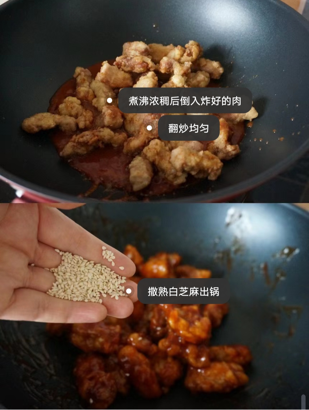 5. 融合的瞬间:锅中留下少量底油,倒入事先调好的酱汁,大火煮至沸腾,观察到酱汁开始变得浓稠时,迅速倒入炸好的里脊肉,快速翻炒几下,让每一块肉都能均匀地裹上酱汁。最后,撒上一把熟白芝麻,增添香气,即可出锅。