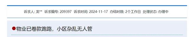最近,有网友在政务平台上投诉称,沙市区某物业已卷款跑路了,小区杂乱无人管。