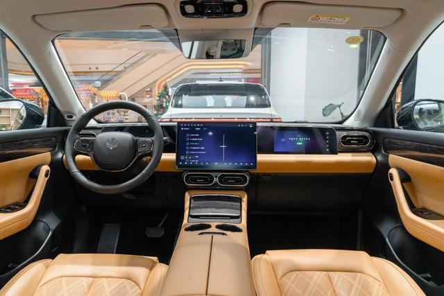 车内设计延续了零跑家族的风格,具有很高的辨识度。T型中控台通过起伏的面板造型,展现出丰富的层次感。车内大量使用了软性材质,并与撞色设计相结合,营造出一种强烈的精致感和高级感。方向盘采用双幅式设计,并用皮质材料包裹,握感出色。前方是10.25英寸的全液晶仪表盘,显示信息全面,读取清晰。中控部分则是一块14.6英寸的悬浮式OLED屏幕,分辨率高达2.5K,显示效果极为细腻。副驾驶位置还配有一块10.25英寸的娱乐屏幕,这三块大屏幕支持联动功能,极大地提升了车内的科技氛围。另外,在前排还设有双杯架和15W的手机无线充电功能,为日常使用提供了便利。