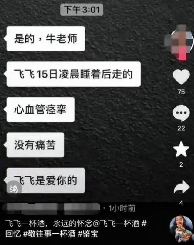 对于飞飞的离世的具体原因,他的好友透露是睡眠中心血管痉挛。