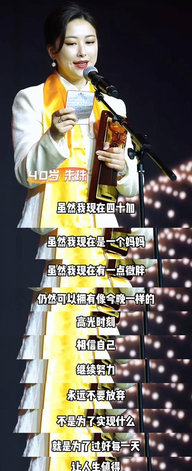 她提到虽然自己已经是40岁的妈妈,且身材微胖,但仍然可以拥有今天这样的高光时刻,要相信自己继续努力,永远不要放弃,不是为了实现什么,就是过好每一天,让人生值得。朱珠不愧是人间清醒,活的好通透。