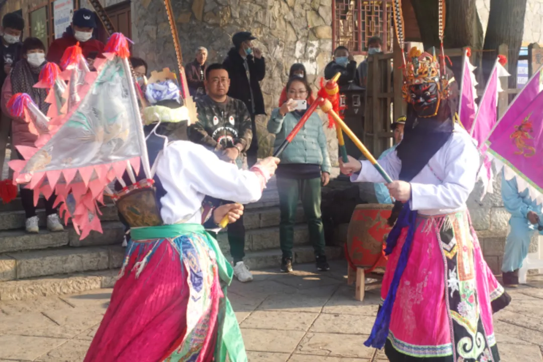 我还见识了一场热闹非凡的地戏。地戏以杨家将,岳家将三国英雄为主角,赞美颂扬报国的忠臣良将,演绎的是古代金戈铁马的场景,传颂汉民族历史故事。