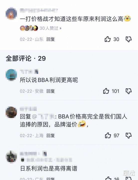 而这些车企的大幅度降价,又使不少网友对这些车的利润又有了一番新的看法,类似“一打价格战才知道这些车原来利润这么高”、“日系利润也是高得离谱”等等诸如此类的评论层出不穷。