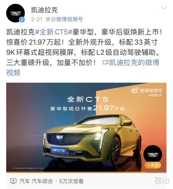 2月21日,凯迪拉克宣布全新CT5豪华型豪华后驱版焕新上市,起售价为21.97万元起。相比起去年12月上市的新车型指导价直接降了7万元,堪称“价格屠夫”,震惊了一众车圈内外的看客,这也太狠了。