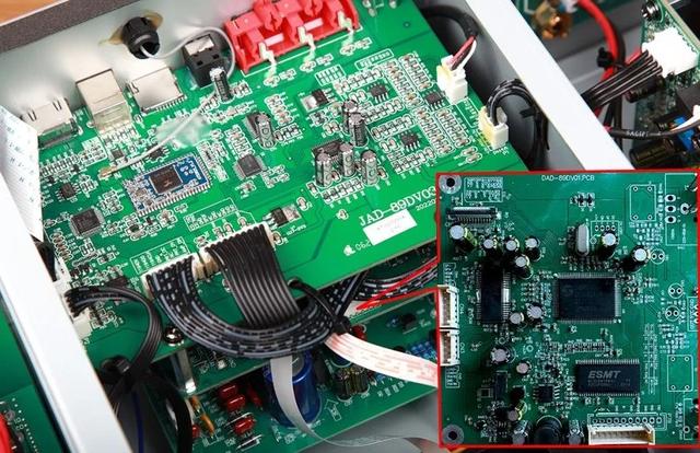 在功放右侧,则是AD-89D功放主场,主力一块巨大的纯阳级钝化染色工艺精加工处理的铸铝梳状散热器,紧贴其上的两张左右声道功放电路板,电路板上的电子元件都是小型贴片元件,经由程控自动化波峰焊流水线接贴于其上,工艺先进,可靠性极佳。