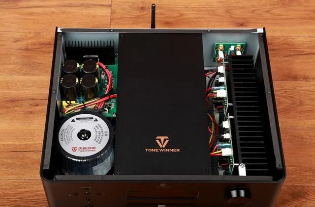 内部结构打开铝合金盖板,里面是被分成三箱的屏蔽式结构,左到右分别为供电中心、音频信号的解码与放大电路,以及左右声道的后级功放及功率输出电路。