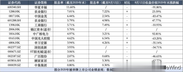Wind数据显示,曾在2020年被上市险企举牌的华夏幸福(600340.SH)、农业银行H股、中国金茂(0817.HK)、农业银行A股、工商银行H股等机构均有较好股息表现。
