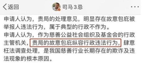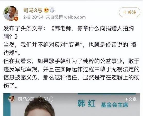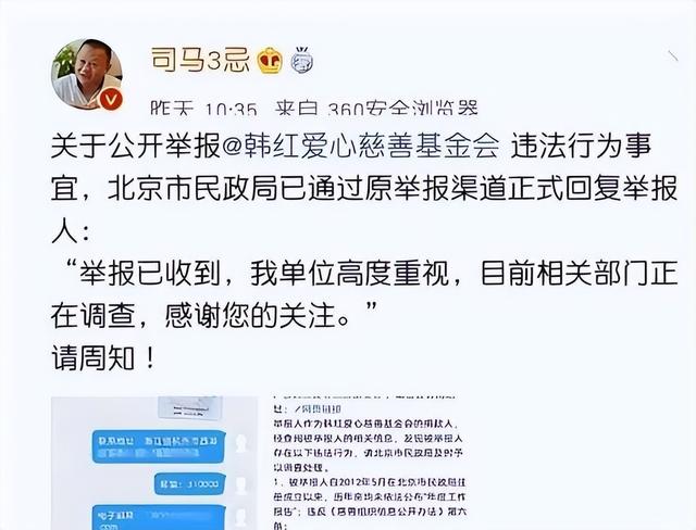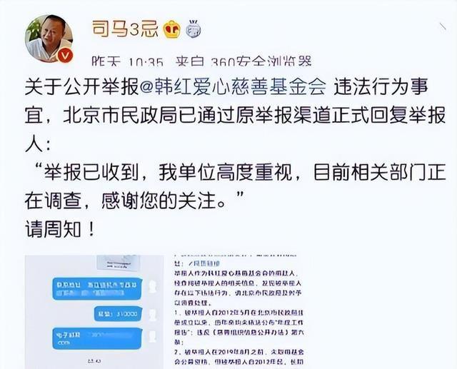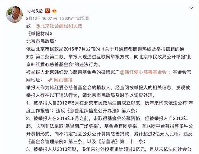 2020年2月,“司马3忌”实名举报韩红基金会存在诸多违法行为,例如“未依法公开年度工作报告”、“未经取得公募资格便进行长期非法募捐活动”以及“高达三亿元人民币的善款去向不明”等。