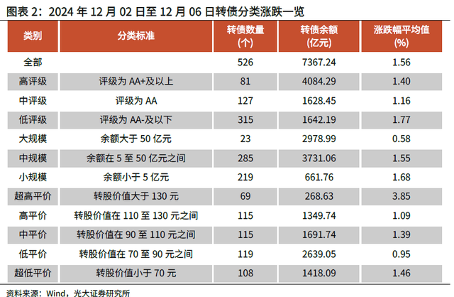 分转债规模看,大规模转债(债券余额大于50亿元)、中规模转债(余额在5至50亿元之间)、小规模转债(余额小于5亿元)本周涨跌幅分别为0.58%、1.55和1.68%,小规模券涨幅最多。