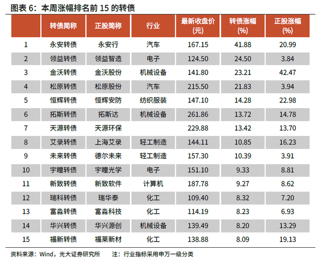 分行业来看,涨幅排名前30的可转债主要来自机械设备(6只)、化工(6只)、汽车(5只);跌幅居前的30只可转债主要来自机械设备(7只)、电子(3只)。