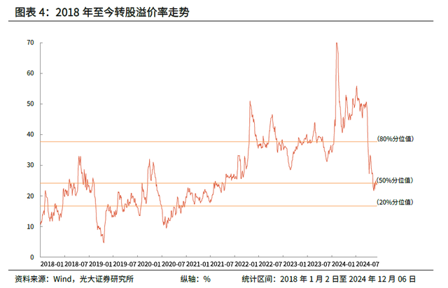 转股溢价率为24.07%,分位值为49.43%。其中,中平价(转股价值为90至110元之间)可转债的转股溢价率为19.67%,稍高于2018年以来中平价转债转股溢价率的中位数(18.65%)。