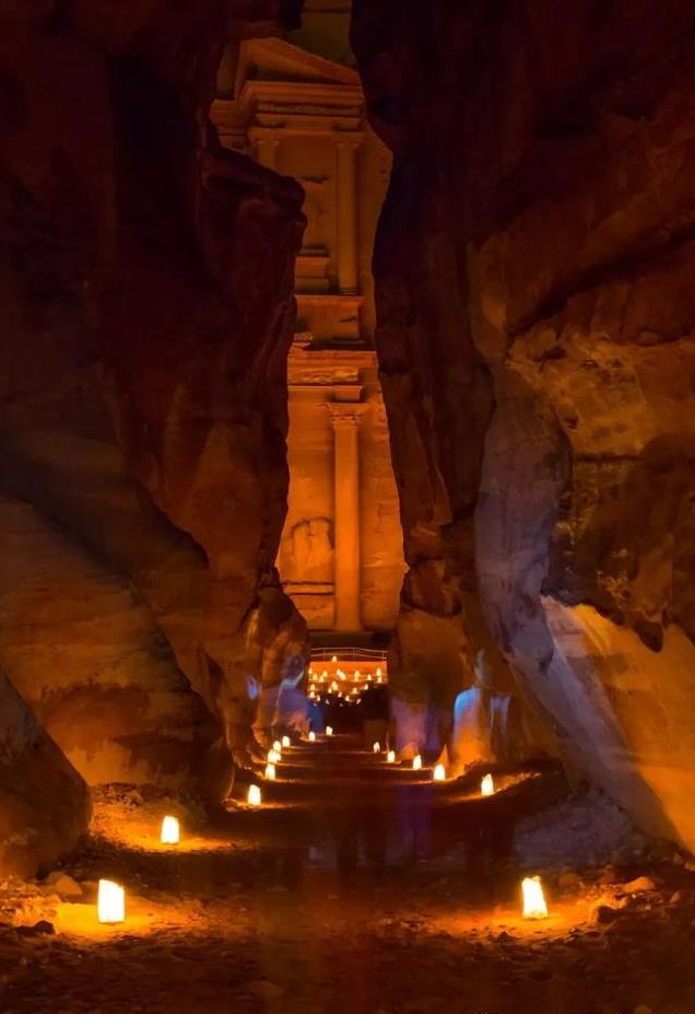 这段通道将会摆上近3000多只蜡烛,最终在神殿门前汇聚成一场小小的穿越时空音乐会,阿拉伯古乐在贝都因人手下奏响,头顶漫天星河,烛光摇曳中,千年前的佩特拉触手可及。