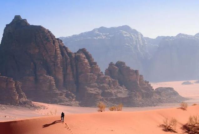 从瓦迪拉姆到亚喀巴,这是约旦步道的最后一段也是最长的一段,岩石地形崩塌成沙子,瓦迪拉姆的雄伟壮丽开阔,变成了广阔的平原。