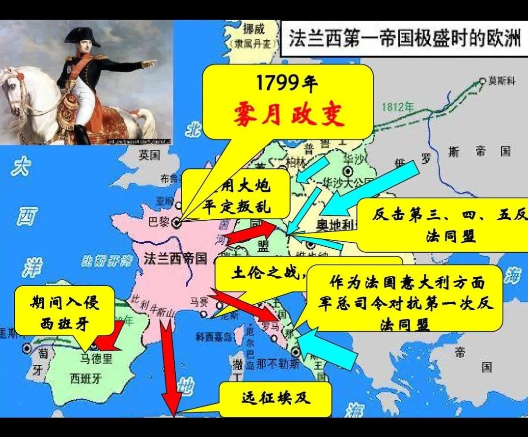 科西嘉岛出现法国著名军事家拿破仑。拿破仑一生都是保护法国权力。拿破仑多次击败了英,普,奥,俄多国组建反法联盟,保护法国大革命胜利果实。拿破仑一度控制大部分欧洲土地在,这也是欧洲最有可能实现大一统机会,可惜远征莫斯科失败导致拿破仑帝国走下坡路。拿破仑帝国也是昙花一现。