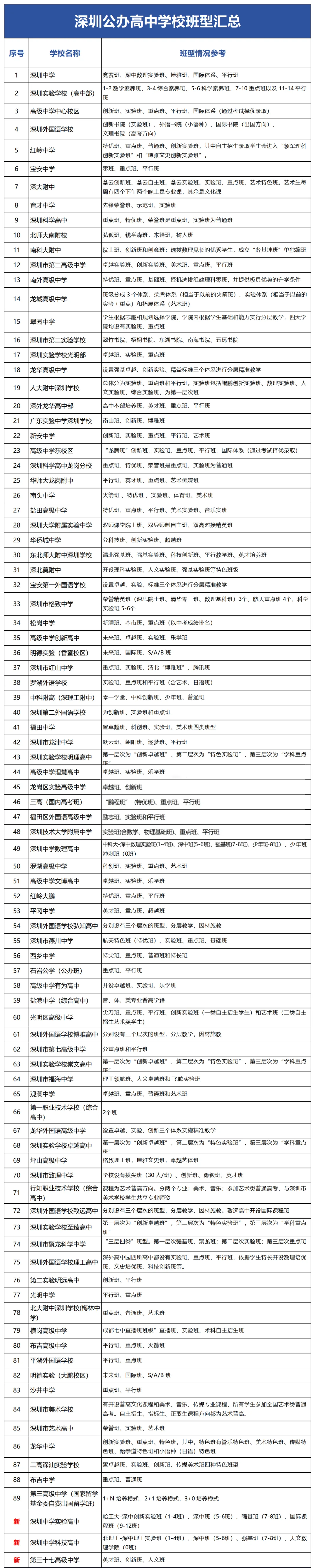 下表汇总了深圳92所公办高中班型情况,供新高一家长了解参考。一般情况下每年各校班型设置变化不大。2024年深圳各公办高中校高一班型最终安排请以学校最新发布为准。