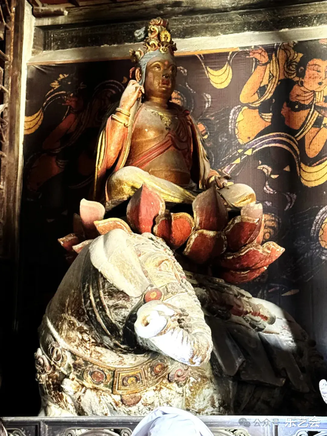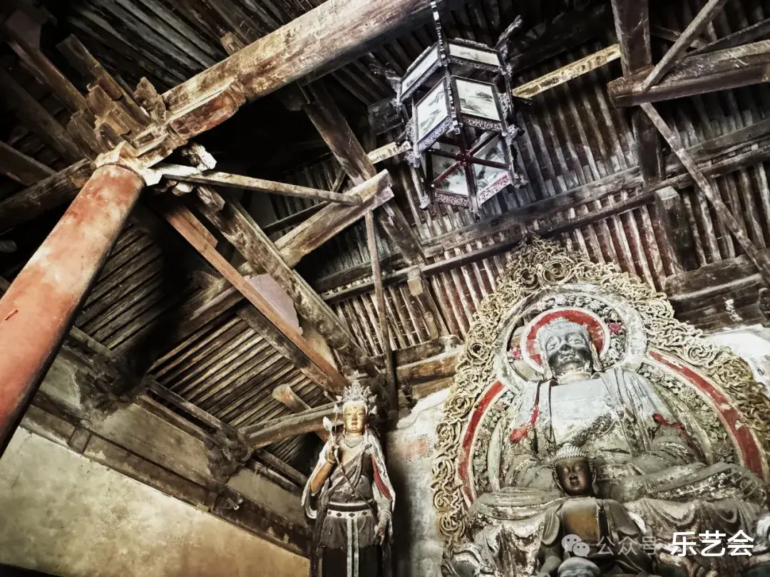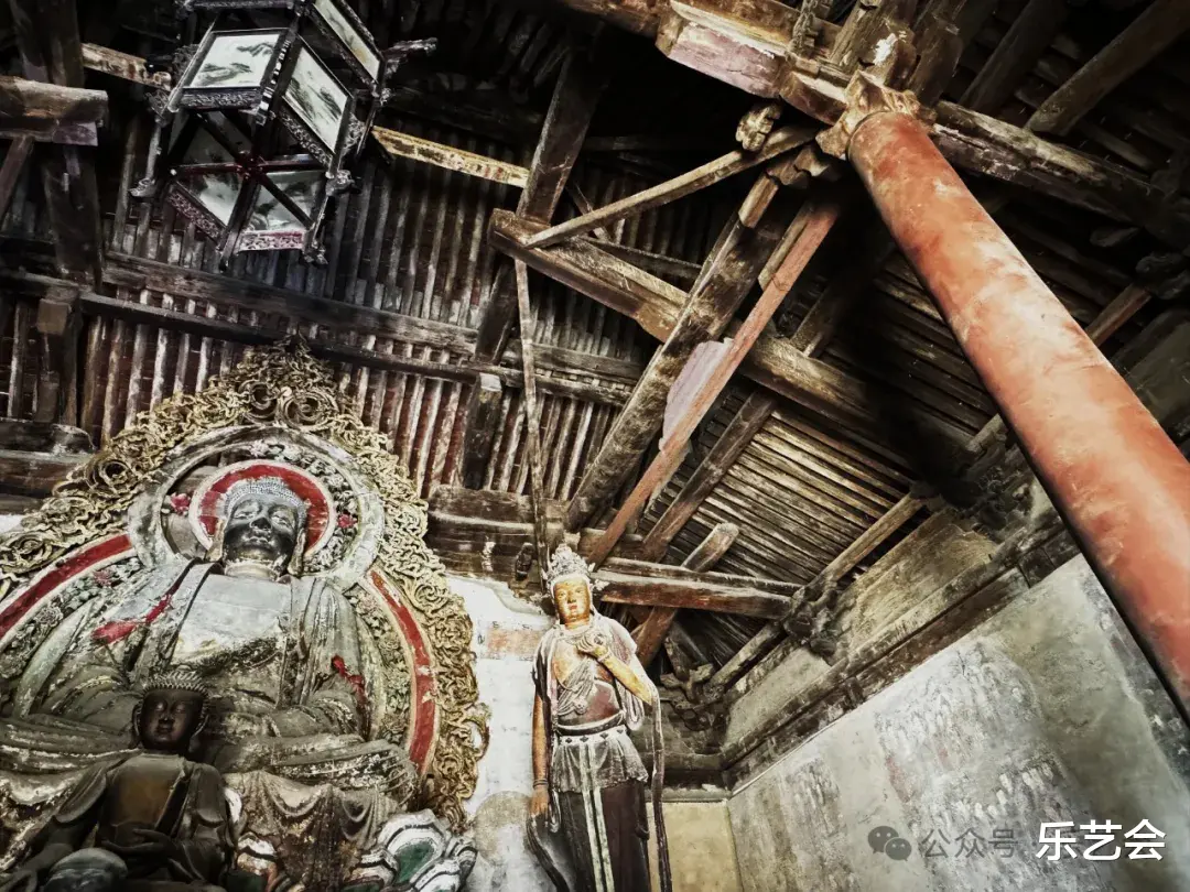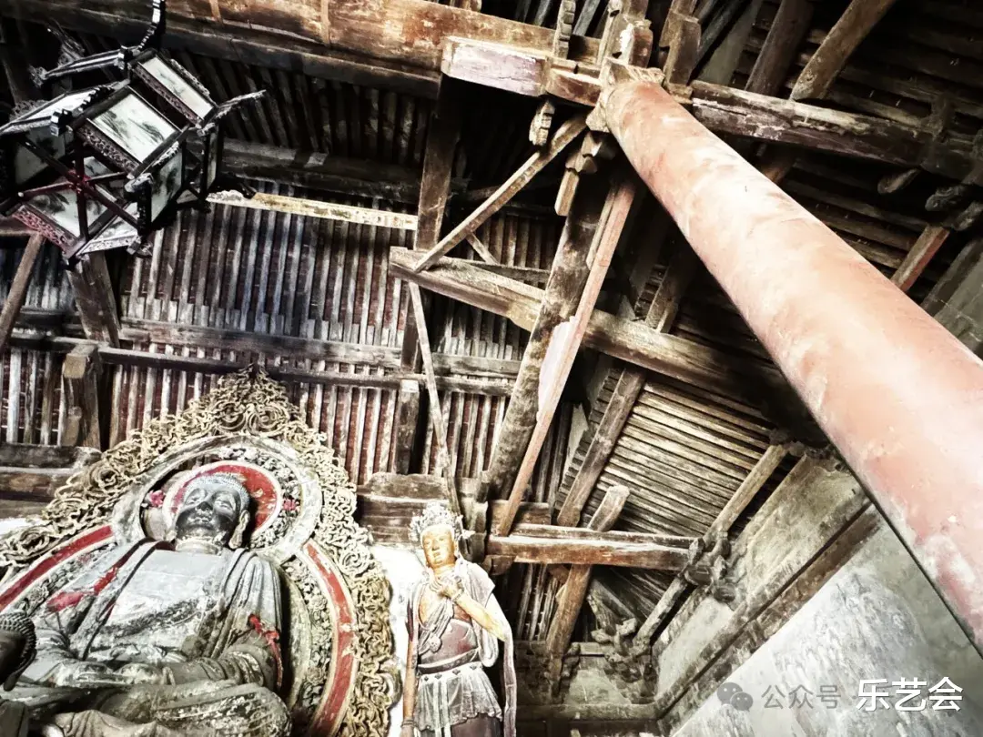 弥陀殿梁架结构比较独特,在四根金柱上用大额枋构成井口型框架,外围四面用大斜梁由檐头向上伸至平梁下皮,直接挑承着平梁以上的荷载,从而节省梁架两缝,四个角上再用角梁,屋顶就用这八根木材挑起。