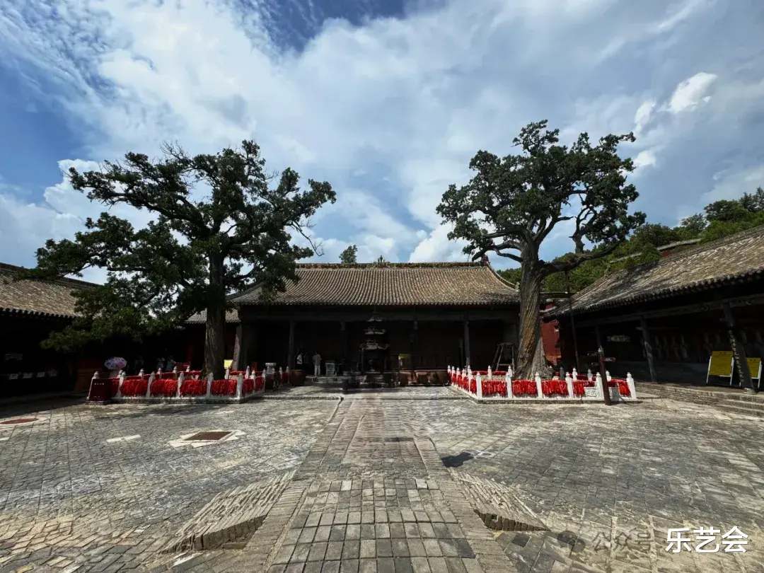 穿过前殿进入中院,正北为大雄宝殿,两株苍劲的古柏在殿前相对而立,大雄宝殿居上寺内中央,又称释迦殿,重建于明景泰三年,面宽五间,进深四间,单檐悬山式。