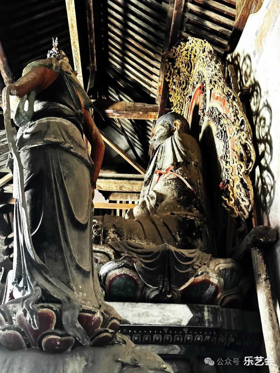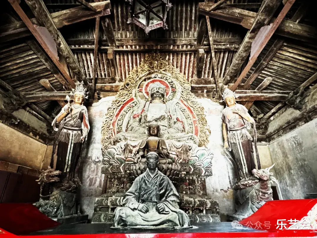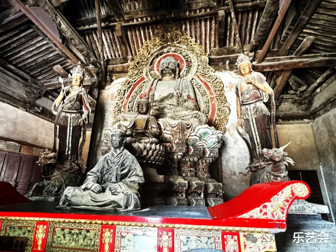 殿内供奉华严三圣像,正中供奉释迦牟尼像,东为文殊菩萨,西为普贤菩萨,均为明代木雕贴金造像,东西两山墙砖台上为当时铸铁十八罗汉像。