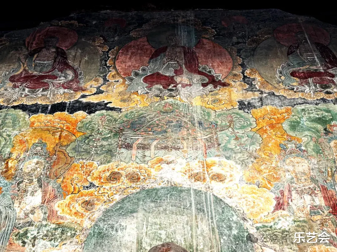 飞虹塔北面是广胜上寺的前殿,因殿内供奉阿弥陀佛,称为弥陀殿,弥陀殿是上寺内一座结构较为奇特的元代建筑,殿为琉璃屋顶,单檐歇山式,面宽五间,进深四间,殿内供奉西方三圣像,正中位铜铸阿弥陀佛,两侧为泥塑观音菩萨和大势至菩萨,殿内四周陈列红色藏经柜,稀世孤本《赵氏孤儿》原存放于此。