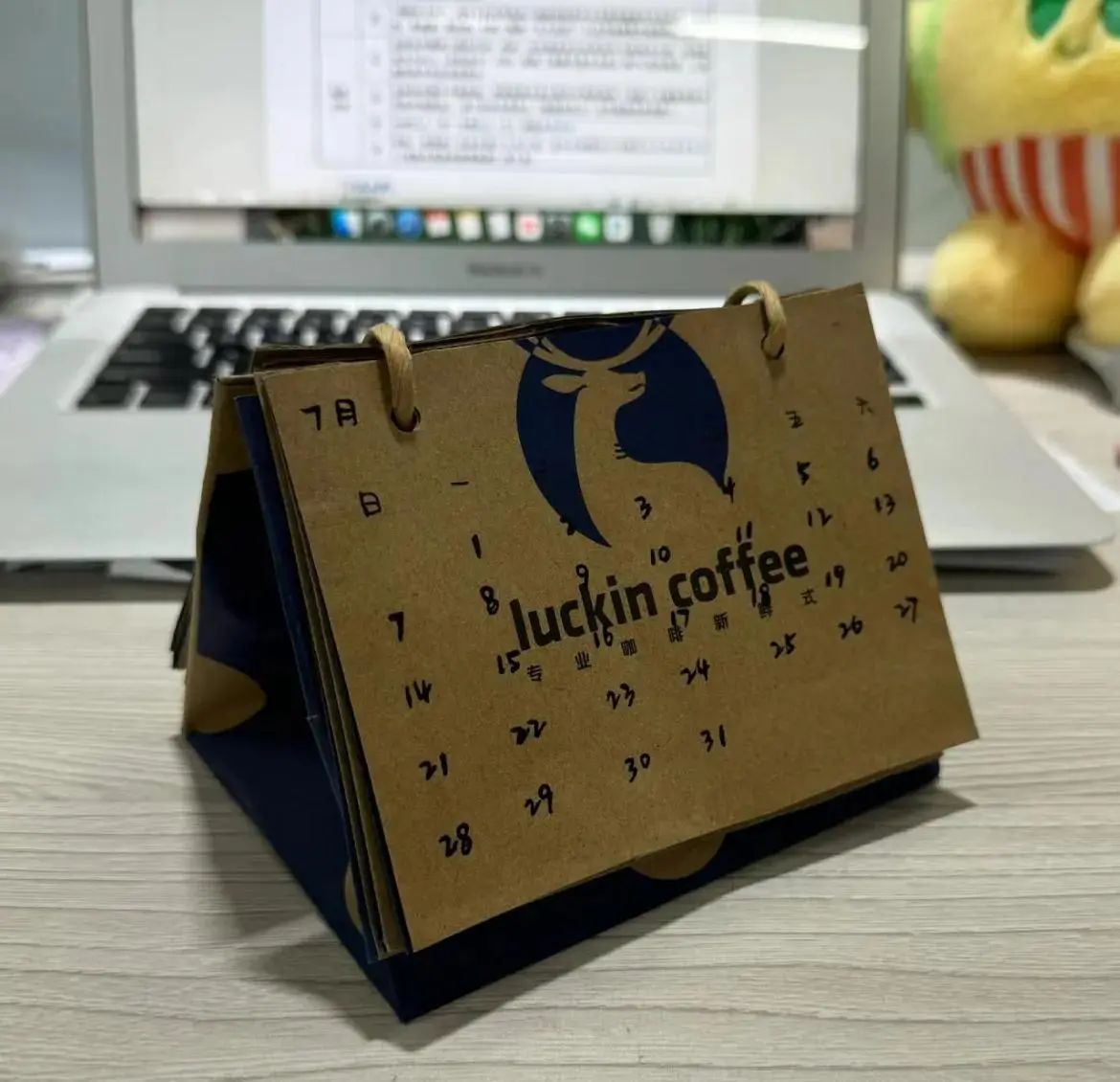 具体做法也很简单,将咖啡手提袋拦腰一分为二,下部分做桌面立体支撑部分,上半部分则写上月份、日期;