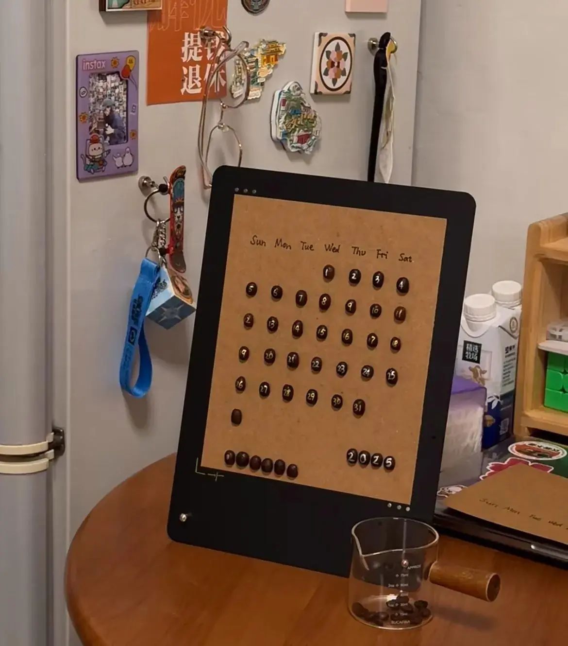 当然,没有背板的,也可以把写好数字的咖啡豆吸在冰箱上,这样日历有了,冰箱贴也有了,简直一举两得。