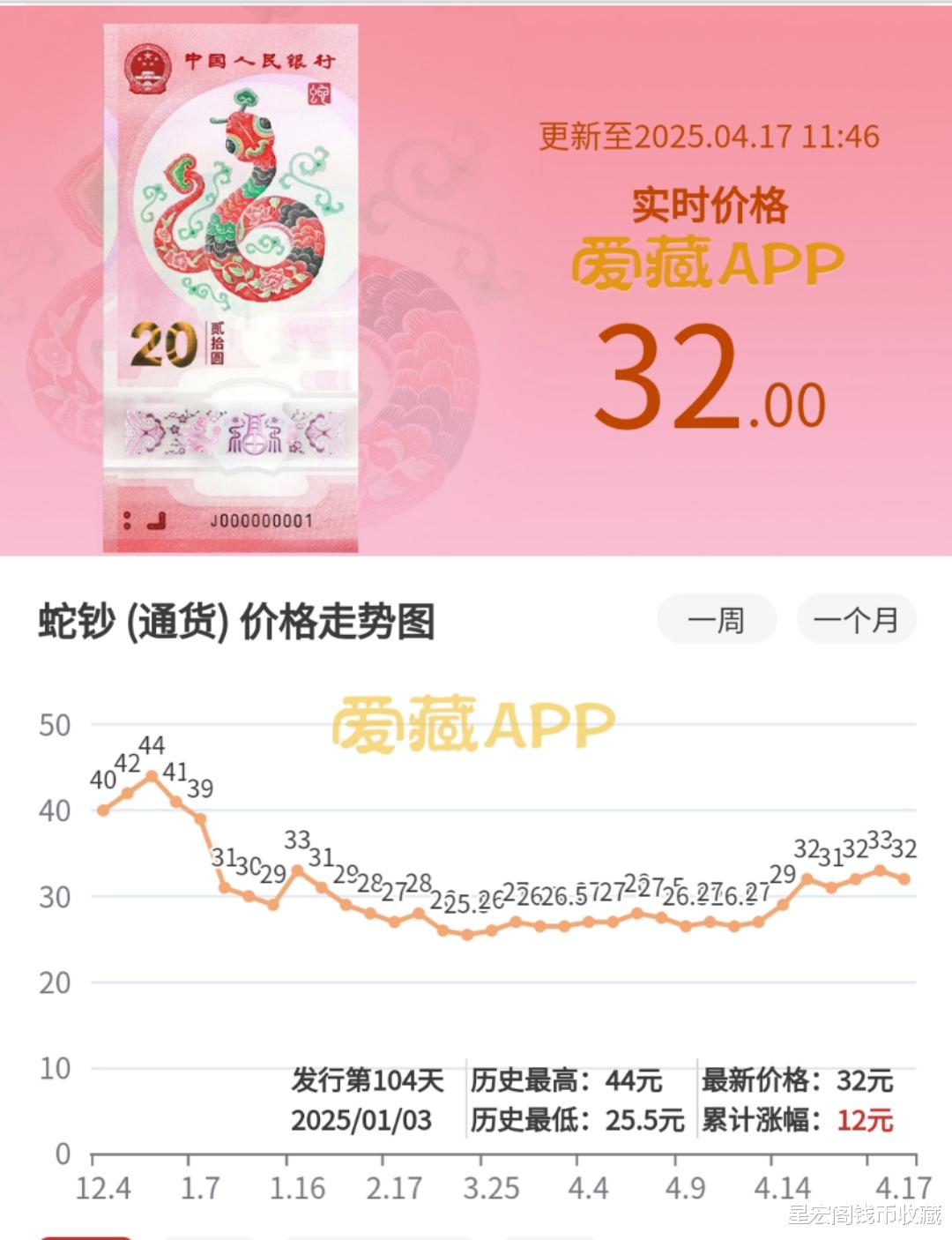2025年蛇年纪念钞这两天通货市场行情也有明显的上涨,目前通货的价格也已经到了33元以上。2025年蛇年纪念钞其实整个品种当中无47的品种,上涨幅度是近段时间最大,目前报价已经到了85~95元左右。记得在前段时间整体行情还是只有在50元左右,现在的市场行情直接上涨到80元以上。