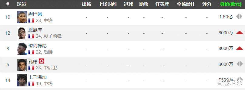 皇家马德里队主力后腰琼阿梅尼目前身价8,000万欧元,在法国国家队队内身价排行榜上排名第三。