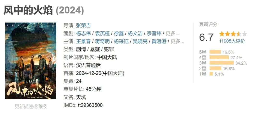 而在《风中的火焰》中,蒋奇明终于演上主角了。只可惜,这部剧的评价,却不如前面提到的那些作品。